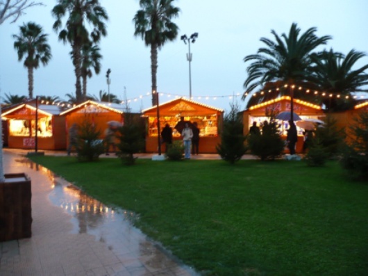 Ein bisschen verregnet: die kleinen Holzhütten im weihnachtlichen Menton und seine Palmen. Schaut richtig, Ihr findet Euren Babelianer mit einem Regenschirm im Zentrum...