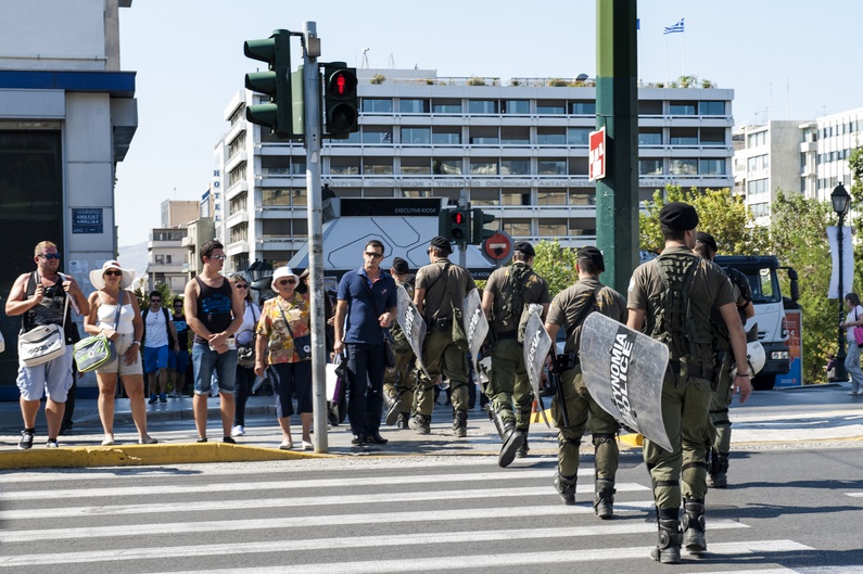 Unser Annäherungsversuch an das junge Herz der „radikalen“ Linken ist gespickt von „Zwischenfällen“, die einen Überblick über das politische Thermometer des Landes bieten. An einem warmen Vormittag protestieren auf dem Sintagma-Platz die Schüler der Musikschule mit Entschlossenheit vor einem Polizeiaufgebot gegen die jüngsten Einschnitte im öffentlichen Nahverkehr. «Nach fünf Jahren des Protestes wendet sich Griechenland nach links», erzählt ein junger Medizinstudent. Nicht weit entfernt, vor dem Sitz des Wirtschaftsministeriums demonstrieren einige Studenten gegen die Regierung, während sie die Fahnen der kommunistischen Gewerkschaft PAME schwenken. Die Spannung ist spürbar, es liegt was in der Luft. Zum Schutz des Gebäudes sind sogar einige grüne Uniformen der Armee zu sehen. Einer der Soldaten fragt uns aggressiv nach unserer Erlaubnis zu fotografieren.