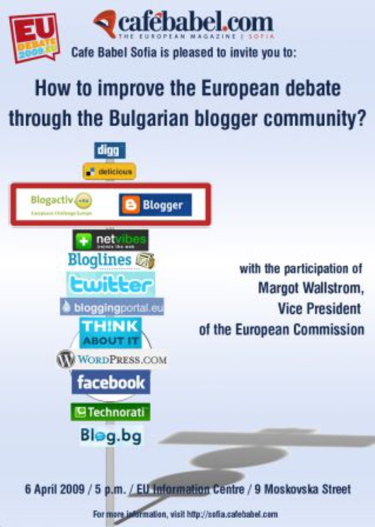 Starting with a short presentation of eudebate2009.eu (the multilingual, European platform, where opinion leaders, politicians and the civil society can exchange and have a voice), the debate will focus on who, in Bulgaria, are blogging about Europe? Could the bloggers bring up the main issues (concerns and expectations) of the Bulgarian civil society and stimulate the European political conscience?