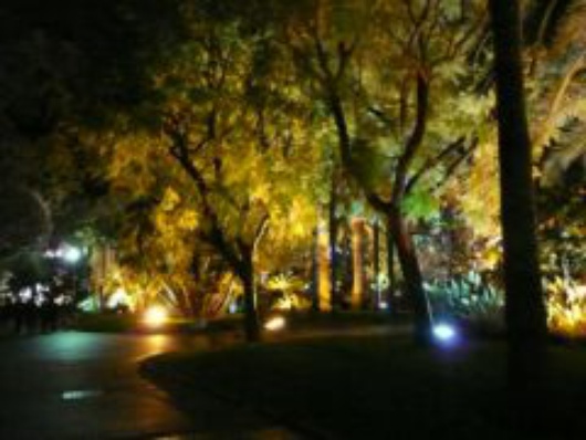 Night falls on the city centre and round abouts are shinning bright.