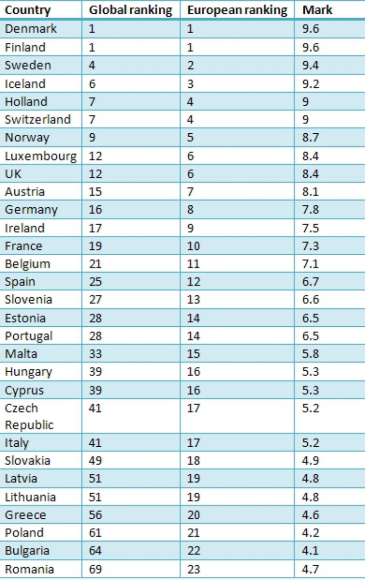 But is this really news to anyone? Transparency International compiles a list each year, scoring each country from one to ten. The swots of the class are the Scandinavian countries, as usual. With 9.6 points, Denmark and Finland lead the way in both Europe and on the entire planet, followed closely by Sweden and Iceland.