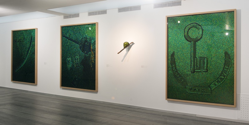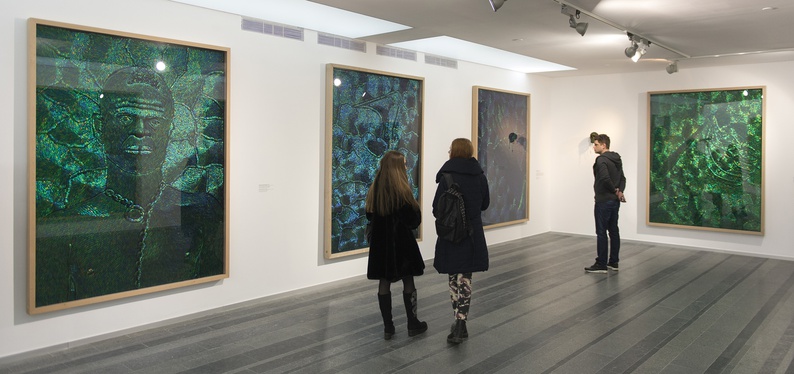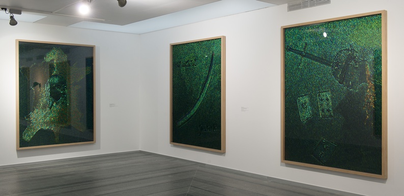 As an artist originating in Belgium, a former colonial empire, Jan Fabre deals closely with violence, exploitation and horrors that individuals in the colonized areas of Africa were exposed to. However, to do so, he makes use of an unusual medium: beetle wings. This direct permutation of natural materials into cultural expression, however, does not involve a rapatious exploitatiomn of nature, but is an act of the artistic recovery of organic waste for the disinterested purposes of cultural critique. These emerald-green, iridescent beetlewings are collected from countries in South-East Asia, where the breeding of jewel beetles contributes both to the local diet and to local craft techniques with ancient roots.