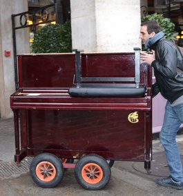 'Today, I'm going to play under the arches in the square near the constitutional court (Conseil d´Etat - ed),' says Steve, as we head off. After piano-pushing a couple of meters and gaining the attention of tourists, he stops in a corner of the rue de Rivoli, a famous shopping street parallel to the river Seine. Steve, wearing jeans, trainers, a leather jacket and a scarf, drops his backpack at his feet, lays out some CDs and a basket on the piano before opening the fall board, or piano lid. Amidst the dense traffic and the chaotic pedestrians, we hear the Minute Waltz by Chopin. The public, looking surprised, start to crowd around him. The chords strike to the beat of the coins as they start to fall in the basket. 'Playing in the street allows me to earn a lot of money,' explains Steve later. He takes short breaks to take in the applause.