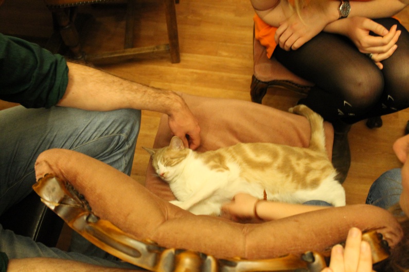 Los gatos, al igual que los bebés, mitigan el dolor y la vergüenza de las interacciones sociales inadecuadas. Si hay un bebé o un animal cerca, los silencios incómodos se rompen tocando a esa criatura. Se puede interactuar sin hablar. Ni siquiera hace falta tener nada en común, solo hay que tocarle y sonreír, creando un vínculo con la otra persona. Para algunos clientes este es el rol del gato. Hay pequeños grupos silenciosos, mirando excesivamente al gato sentado en su mesa.