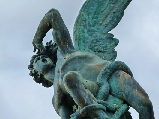 Laura Gallego en su obra Dos Velas Para El Diablo hace referencia a través de la protagonista del relato a este curioso monumento, que no se libra de las miradas de todo aquel que pasa por su lado, de la siguiente manera: “la mano que cinceló esta escultura representó al emperador demoníaco como un hombre joven, musculoso e indudablemente guapo. Una serpiente se enrosca sobre su cuerpo, atándolo al mundo, quizá, mientras él mira al cielo y grita de horror. ¿Es horror o es dolor lo que veo en su rostro? ¿O tal vez desafío?”