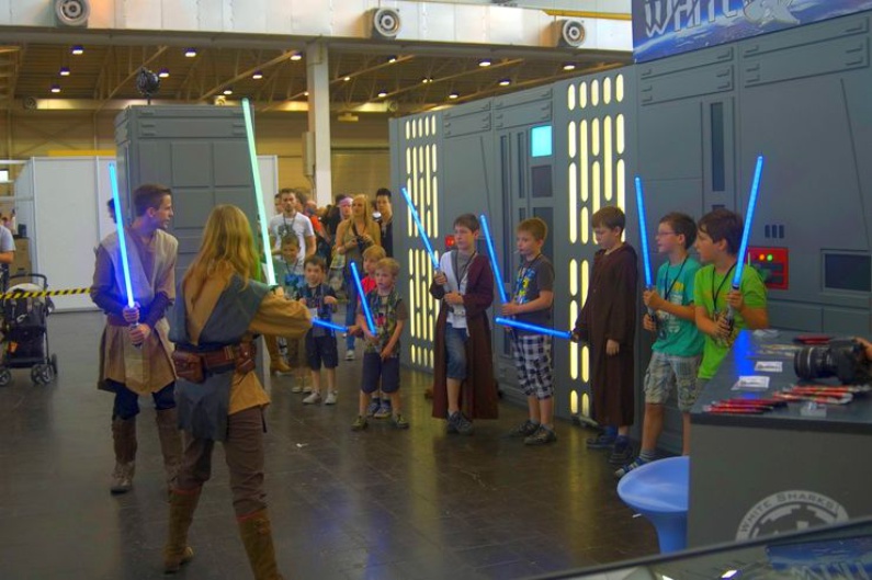 Los disfraces son lo primero en llamar mi atención cuando entro en el recinto ferial. Un soldado clon y de asalto imperial patrulla el desfile. “Jonas, yo soy tu padre”, bromea un hombre disfrazado de Darth Vader con su asombrado hijo disfrazado de Jedi. El joven aprendiz de Jedi lucha por el lado luminoso de la Fuerza, al igual que los pilotos rebeldes vestidos de naranja y blanco y las senadoras de extravagantes capas. Y no sólo seres humano, también Twi’leks azules, Ewoks de peluche, droides de protocolo dorados o un Wampa enorme están a punto de salir. “Es divertido y sienta bien estar aquí con tanta gente que comparte mis aficiones”, afirma contento un hombre disfrazado del cazarrecompensas Boba Fett.