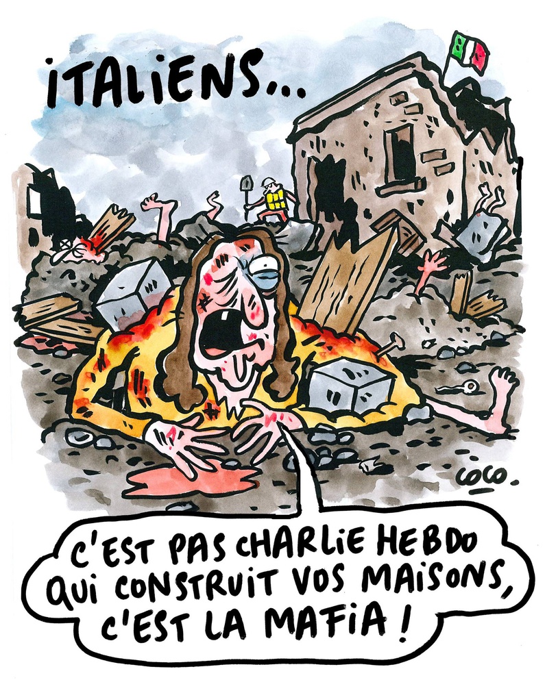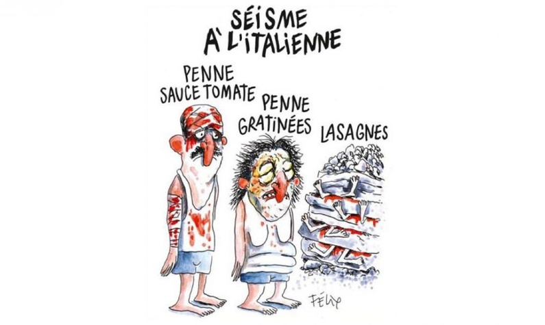 Le 2 septembre 2016, Charlie Hebdo devient à nouveau la vedette de notre page Facebook. Une caricature représente un homme couvert de sang, une femme blessée et des décombres ensanglantés avec des cadavres enterrés. Sur le dessin, un titre : « Tremblement de terre à l’italienne : penne sauce tomate, penne gratinées et lasagnes ».