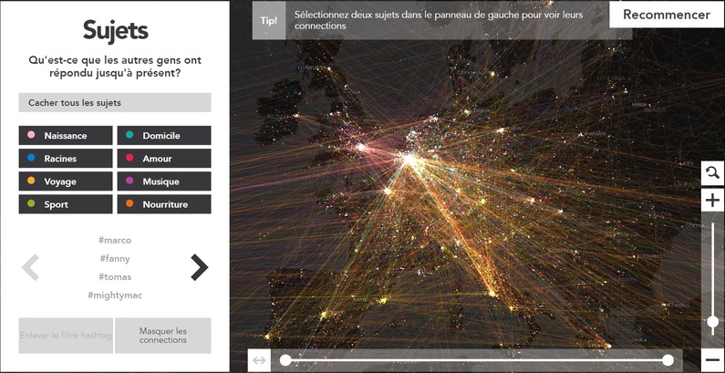 Quels sont, en tant qu'Européens, les aspects qui nous unissent? Dans le cadre de l'exposition temporaire, vous pourrez inscrire votre lieu de naissance, le pays d'origine de votre tendre moitié, de votre plat préféré ou de votre groupe de musique préféré. Le dispositif « INTERACTIONS » crée ensuite une carte illustrant les différentes manières dont tous les Européens sont connectés. Et bonne nouvelle ! Vous pouvez consulter cette carte sans vous déplacer en Belgique, il vous suffit de cliquer ici !