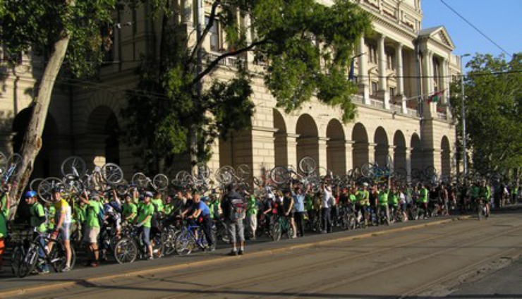 Quelques rues plus loin, la gigantesque colonne de cyclistes défile comme chaque année dans les rues de la capitale hongroise pour demander au gouvernement plus de pistes cyclables. Cette année, le cortège a réuni 35 000 participants.