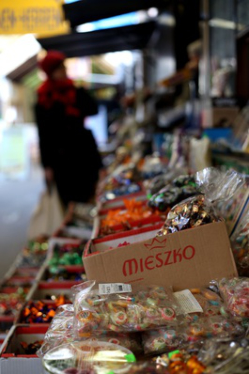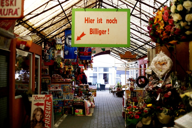 Plus petit mais aussi moins fréquenté, le second marché est situé à quelques centaines de mètres du pont sur l’Oder. À l’abri de ses galeries couvertes s’égrènent les échoppes remplies de marchandises colorées : voilages kitsch, chemisiers en viscose à motif animalier, CD piratés de “Schlagermusik”, nains de jardin et poupées de plastique, fruits et légumes, bonbons et pralines,...