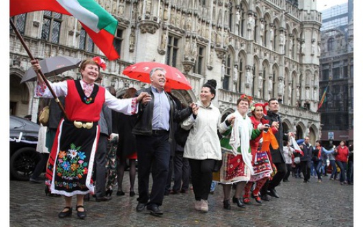 Pour la troisième année consécutive, la Grand-Place de Bruxelles était le théâtre d’un haut-fait du festival : le horo géant. Cette danse typique des Balkans a beaucoup de variantes selon les pays et régions d’où elle est dansée, mais a toujours ceci de commun que les participants se tiennent les mains et forment un cercle avançant et reculant au rythme de la musique. Les ensembles folkloriques Botevgrad de Bulgarie, Lunxhëria d’Albanie et Dillere Destan de Turquie nous donnaient à admirer la beauté et la magie de leur musique dans cette danse à grande échelle qu’est le horo. Mais l’idée n’est pas seulement d’admirer cette danse sinon d’y participer, que l’on soit un touriste ou pas, jeune ou vieux. Beaucoup avaient revêtis leurs plus beaux atours et costumes montrant par là leur amour pour le folklore et les traditions. Parmi les invités on pouvait noter la présence de la commissaire européenne bulgare Kristalina Georgieva, menant la danse, et la députée européenne bulgare Eva Paunova en costume folklorique, leur participation enthousiaste et remarquée a contribué à l’ambiance festive.