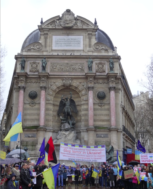 Monika MalbeauxLes manifestations en faveur de l’Euromaïdan rassemblent régulièrement plus de 300 personnes à Paris. La communauté ukrainienne et ses sympathisants se sont réunis pour la dix-huitième fois depuis le rejet de l’accord d’association avec l’Union européenne afin d’entonner des chants patriotiques et faire entendre leurs slogans révolutionnaires.