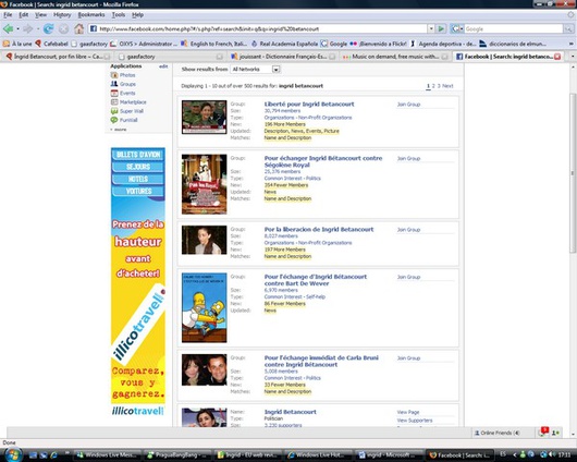 Durante la prigionia della Betancourt sono stati creati dei gruppi su Facebook che chiedevano la sua liberazione – alcuni dei quali contano oltre 70.000 membri – ma, come al solito, il sito ha riservato un posto alla satira. Alcuni gruppi chiedono, ora che la Betancourt è stata liberata, che possa prendere il posto o di Ségolène Royale, o della first lady Carla Bruni.