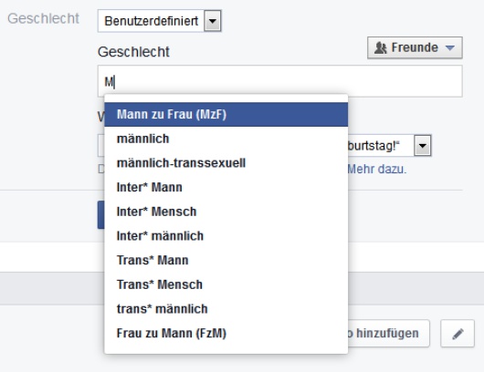 Questo cambiamento è stato introdotto dopo l’esempio che era stato lanciato dalla versione americana del sito Facebook, dove già da febbraio di quest’anno è possibile scegliere a quale genere si sente di appartenere in mezzo a tante opzioni. Insieme alla Federazione Lesbiche e Gay in Germania (Lesben- und Schwulenverband in Deutschland, LSVD), Facebook Deutschland ha ora adottato e incrementato le opzioni introdotte dal sito americano. Alla fine c’erano 60 opzioni differenti, che includevano non solo termini come “transgender”, “drag” e “genderqueer”, ma anche “genderless”. Ora puoi anche dichiarare se vuoi essere appellato come “lei”, “lui” o entrambi allo stesso tempo, e se la tua preferenza personale deve essere mostrata pubblicamente. In questo modo, sesso biologico e genere sono finalmente due cose diverse su Facebook.