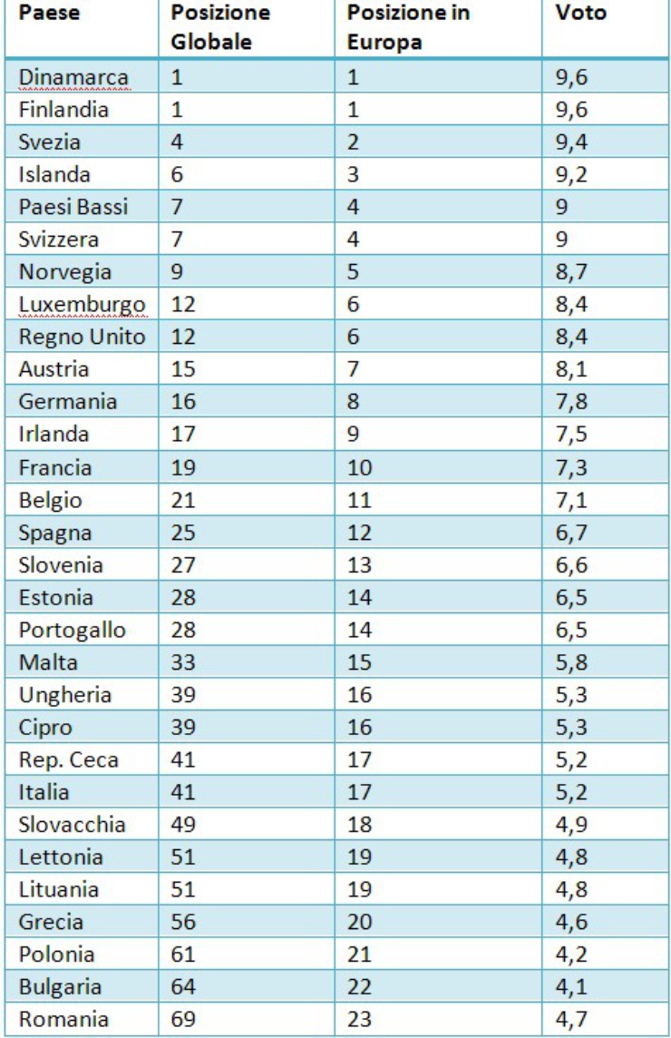 Gli ultimi della lista includono praticamente tutti i paesi degli ultimi due ampliamenti, dall'Ungheria alla Romania. Con una notevole eccezione: l'Italia è il paese dell'Europa Occidentale valutata peggio, al 17° posto su 23, e con una promozione sfiorata: 5,2. Anche la Grecia, altro vecchio membro, ha un punteggio basso, al 20° posto. In coda, con parecchia differenza, si trova la Romania, bocciata con un punteggio di 3,7.