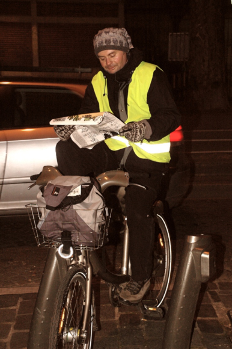 A ten mężczyzna na przykład czytając gazetę czeka po pracy na uruchomienie roweru Vélib na stacji.